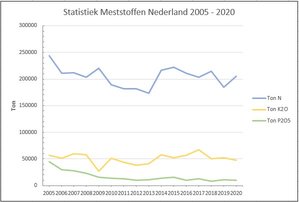 Voor de fosfaat waren er geen noemenswaardige verschillen in 2020 ten opzichte van 2019. Voor kali zien we in 2020 een 10% daling na een stijging in 2019, over de afgelopen 3 jaar is dit echter redelijk stabiel.