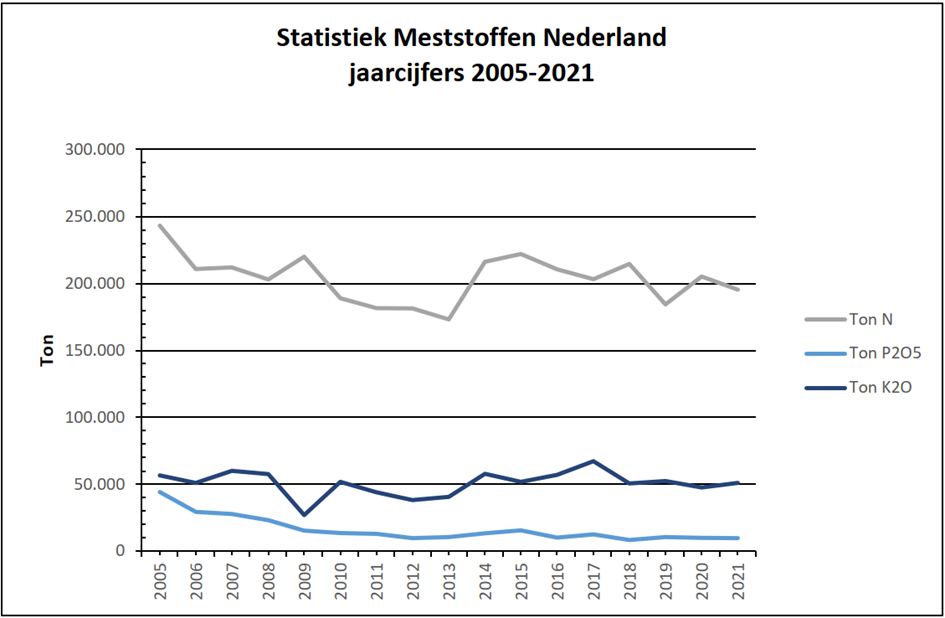 In de afzetcijfers van minerale stikstofmeststoffen voor 2021 zien we in totaal 5% lagere afzet van stikstofmeststoffen veroorzaakt door de trage groei van gewassen in het koude voorjaar. Voor kalimeststoffen was 2020 een slecht jaar waardoor er in 2021 met 7% hogere afzet mogelijk een compensatie heeft plaatsgevonden. Voor de fosfaat bemesting waren er geen noemenswaardige verschillen in 2021 ten opzichte van 2020 (-2%).