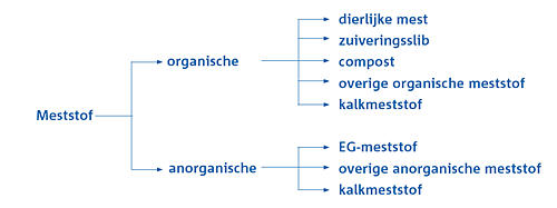 Meststoffen zijn in het kader van de regelgeving ingedeeld in een aantal groepen. In onderstaand schema wordt deze indeling weergegeven.