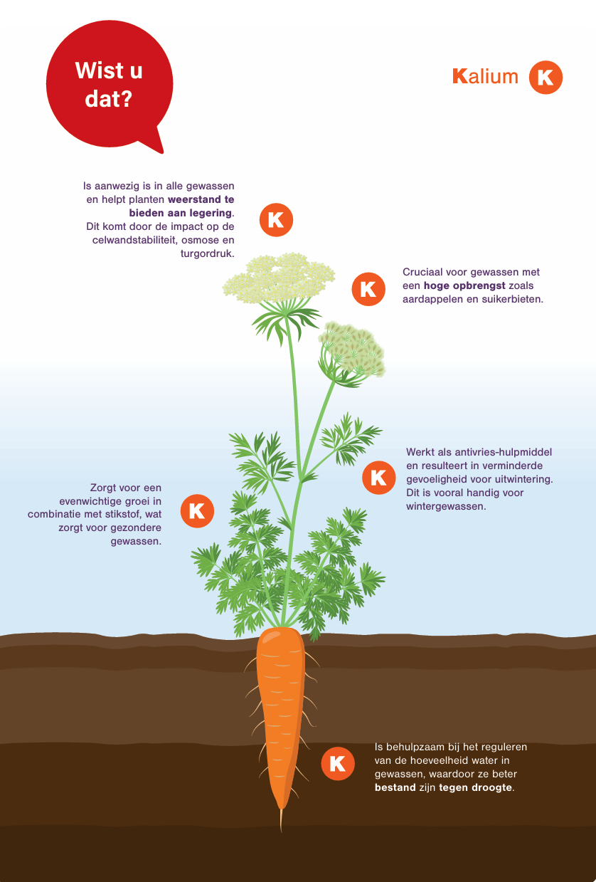 Kalium (K) is na stikstof, de voedingsstof die door planten in de grootste hoeveelheid wordt opgenomen. Kalium is geen bestanddeel van de organische stoffen waaruit de plant is samengesteld. Het komt in het celvocht uitsluitend voor in de vorm van kaliumionen. Deze kaliumionen vervullen echter een onmisbare functie bij de vochthuishouding en de stofwisselingsprocessen in de plant. Daardoor heeft kalium een gunstige invloed op de opbrengst en kwaliteit van gewassen.