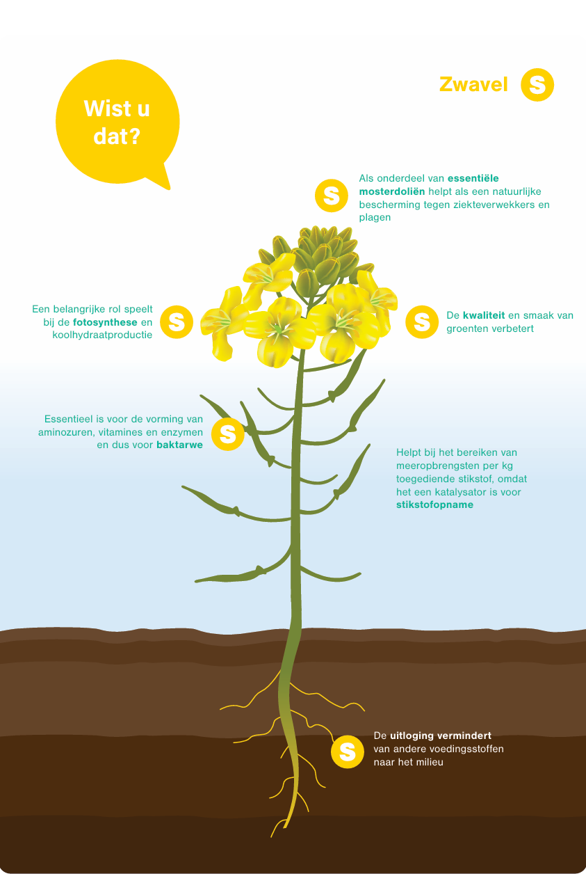 Zwavel (S) is na stikstof, kalium en fosfaat het belangrijkste plantenvoedende element. De S-voorziening van veel landbouwgronden en -gewassen is afgenomen.
